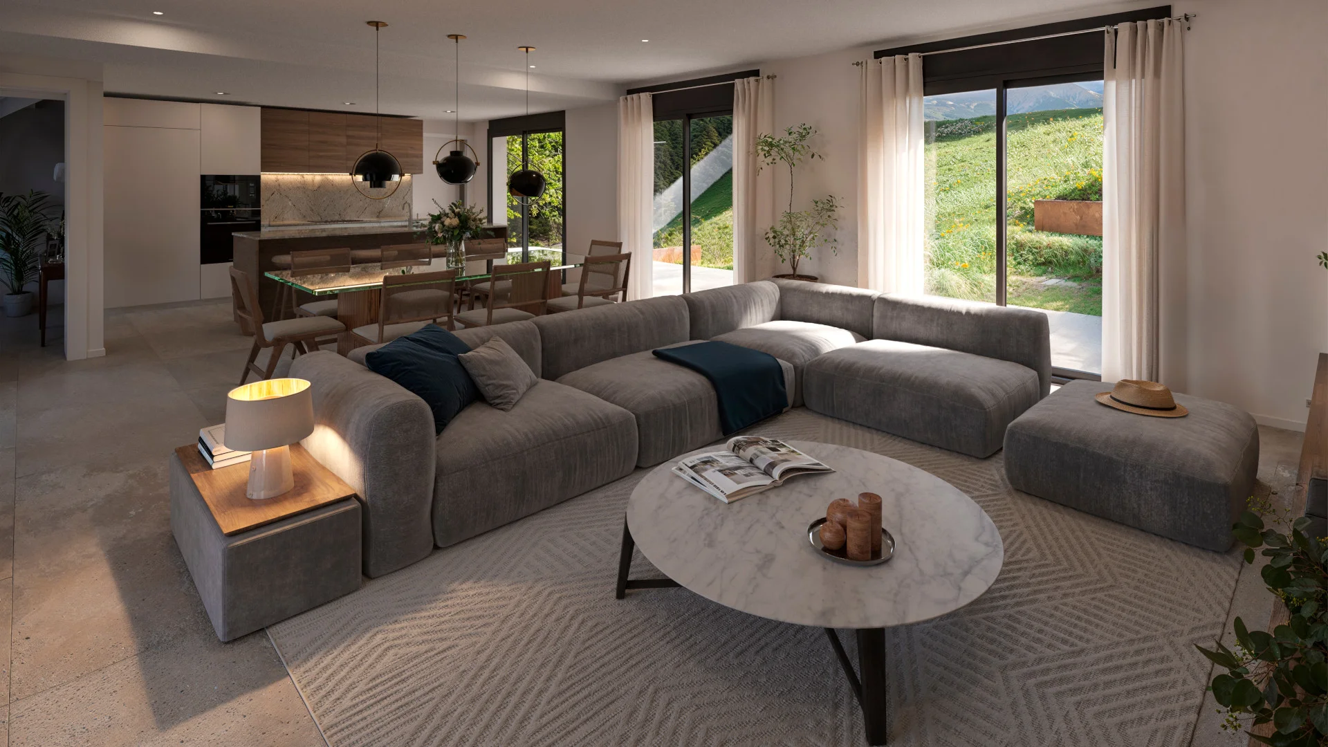 Cocina abierta con isla central.